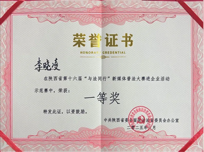 12月,在中共陕西省委全面依法治省委员会办公室主办、商洛市委依法治市办承办的第十六届“与法同行”新媒体普法大赛总决赛中,公司员工代表西安市参赛,并斩获总决赛亚军